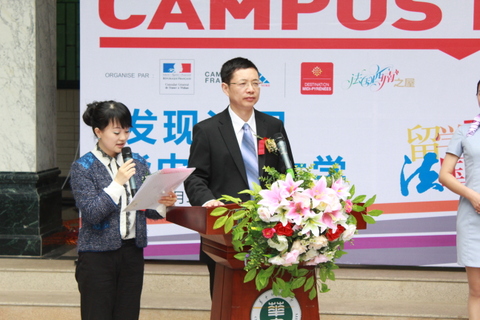 5月17日,由我院和外事处承办的中法建交50周年——“发现法国”主题日活动开幕式在我校老图书馆前举行。法国驻武汉总领事馆总领事马天宁(Philippe MARTINET),法国驻武汉总领事馆教育专员马瑞克(Eric MOLAY),华中师范大学校长杨宗凯,副校长李向农、王恩科、我院院长廖美珍、党委书记李云、法语系老师以及相关部门部门负责人出席开幕式。开幕式由副校长王恩科主持。