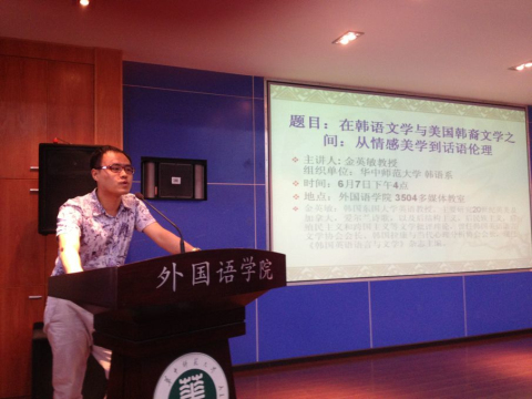 2013年6月7号下午,韩国东国大学英语教授金英敏在我院3504多媒体教室进行为韩语系师生作了一次主题为“在韩国文学与美国韩裔文学之间——从情感美学到话语伦理”的讲座。讲座由韩语系老师韩龙浩主持,韩语系系主任池水涌教授参加了此次讲座。