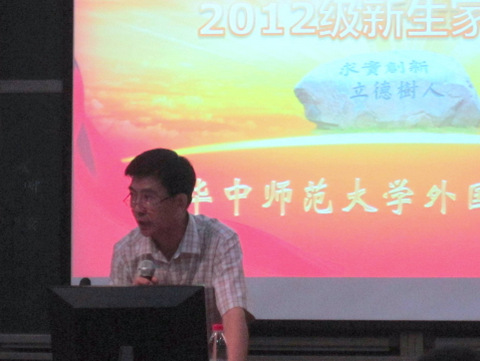 廖院长首先代表外院对2012级新生和各位家长的到来表示热烈欢迎,他从发展历程、学科建设和荣誉表彰等方面介绍了华师和外院的基本情况,并以自身经历作证,让家长们对外院更有信心。廖院长强调,学生应该勤奋学习,打下扎实的专业功底,培养自己的国际化视野。他还呼吁家长们不要溺爱学生,希望能在家长和学校的共同努力下,培养出优秀的外语人才。