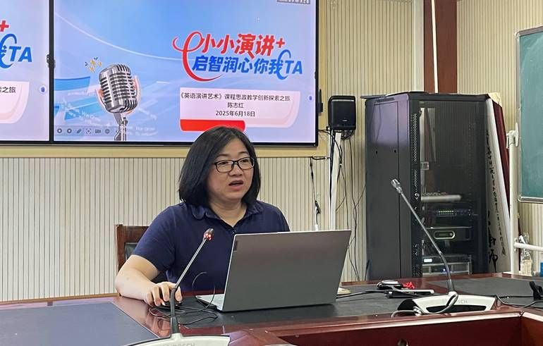 陈志红老师以“英语演讲艺术课程思政教学创新探索之旅”为题,分享了国家级一流本科课程《英语演讲艺术》的建设以及参加湖北省高校教师教学创新大赛的经验。她紧扣课程思政建设要求,通过“小小演讲家-启智润心你我TA”的特色课程设计,将家国情怀、文化自信、专业伦理等思政元素自然融入英语演讲教学。陈老师以学生发展为中心,提出基于终身学习理论的“三阶四导五步实练”教学法,通过引导学生从“发现自我”到“品鉴世界”“感悟中国”,再到“探索专业力量”的体验式进阶成长,实现语言表达与价值塑造的同步提升。