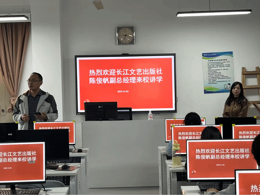 2025年11月3日下午,我院“翻译及本地化项目管理”课程行业专家进课堂系列讲座第二场正式开讲。在文化市场高速发展、翻译出版行业面临深刻变革与多元机遇的时代背景下,长江文艺出版社副总经理陈俊帆受邀为翻译专业硕士研究生,作了题为《全球视野下的出版业产业概况、翻译实践核心要点与当下文化产业新态势》的专业讲座。本次讲座由覃江华老师主持,内容兼具理论深度与实践价值,为在场师生呈现了系统的行业知识体系。