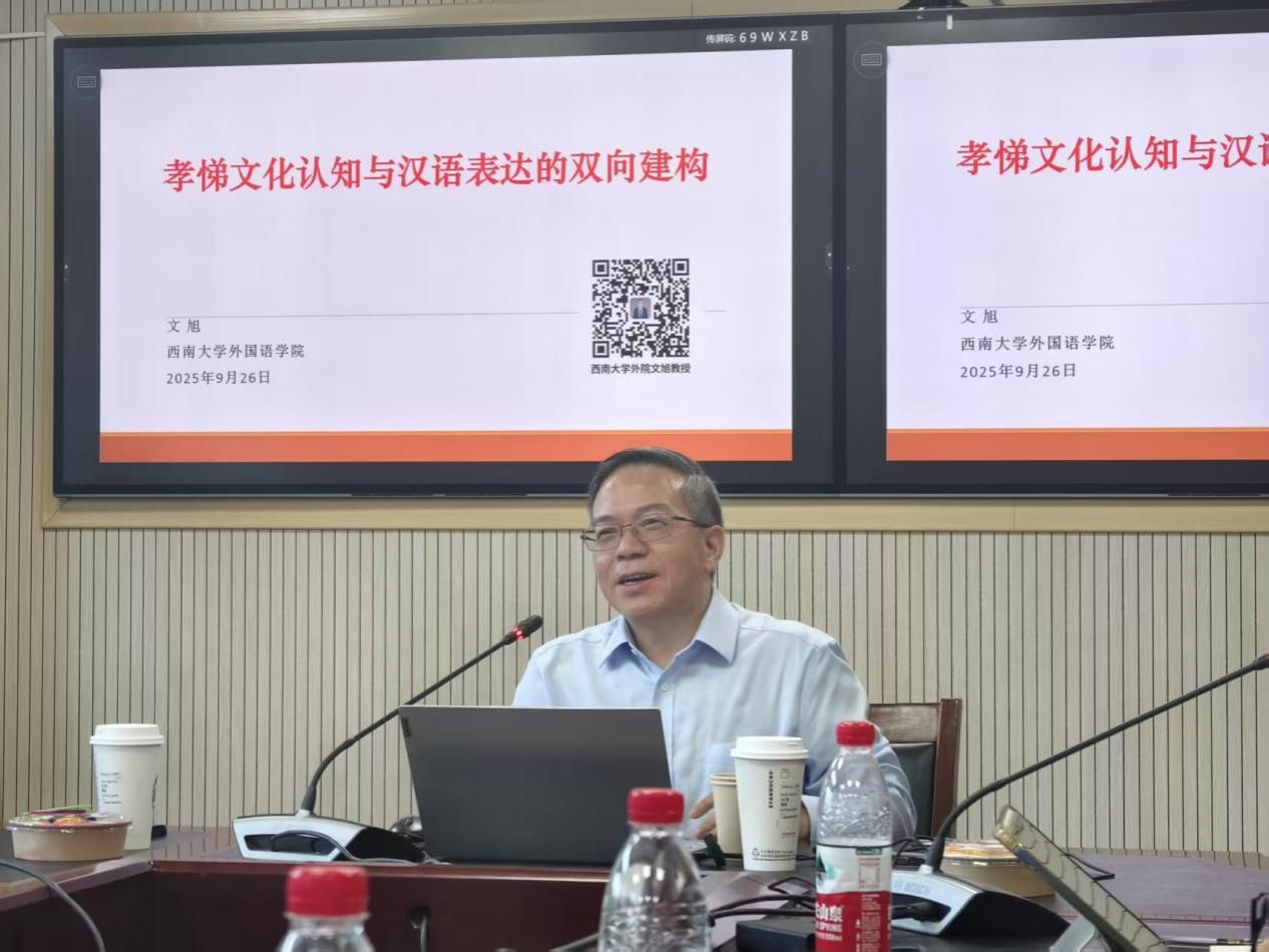 系列讲座的第三场由西南大学文旭教授主讲,主题为“孝悌文化认知与汉语表达的双向建构”。文旭教授从文化认知语言学与伦理学交叉融合的视角,系统梳理了“孝悌”这一儒家核心伦理范畴的文化内涵与认知结构。他论证了孝悌文化如何深刻影响并塑造汉语的词汇选择、句法结构和语用规则,同时,汉语又如何作为重要的载体与媒介,反作用于文化认知的传承与固化。讲座不仅揭示了语言与文化相互建构的内在机制,也为中华优秀传统文化的创造性转化与创新性发展提供了基于语言研究的学理支持。