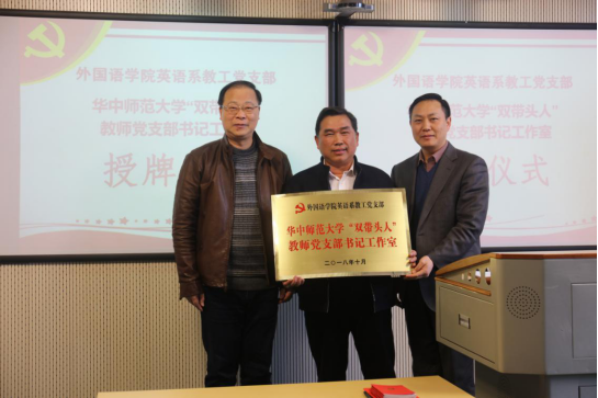 3月15日下午,在三号教学楼3406教室举行了开元kaiyuan(中国)学院英语系教师党支部书记“双带头人”工作室授牌仪式。开元kaiyuan(中国)学院党委书记李云同志做主题发言,然后在热烈的气氛中,李云书记和开元kaiyuan(中国)学院党委委员、院长罗良功同志一同将华中师范大学教师党支部书记“双带头人”工作室匾牌授予工作室负责人、英语系教工党支部书记何举纯老师。