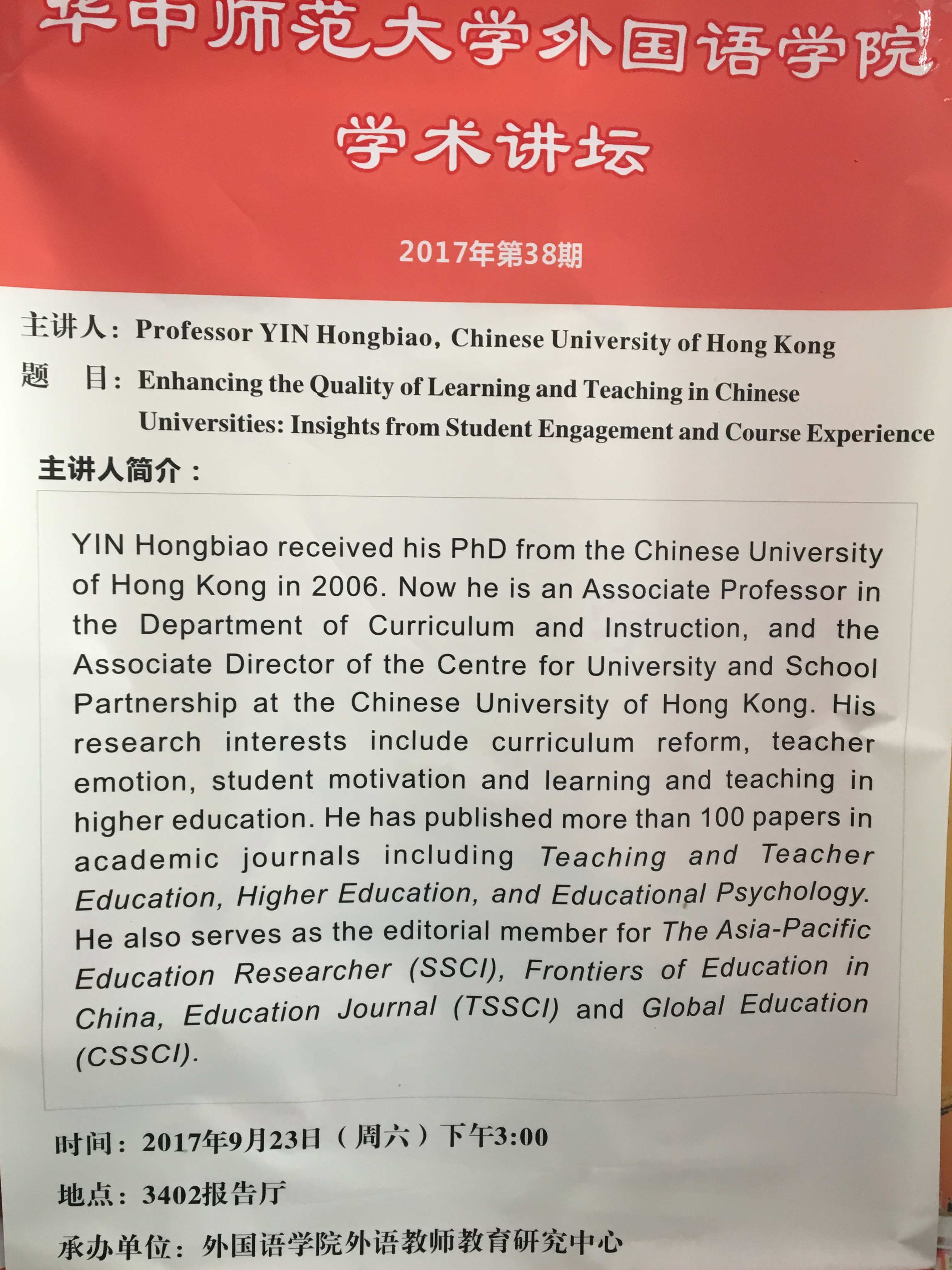 YIN Hongbiao received his PHD from the Chinese University of HongKong in 2006. Now he is an Associated Professor in the Department of Curriculum and Instruction, and the Associate Director of the Centre for Universityof Hong Kong. His research interests include curriculum reform, teacher emotion, student motivation and learning and teaching in higher education. He has published more than 100 papers in academic journals including Teaching and Teacher Education, Higher Education, and Educational Psychology. He also serves as the editorial member for the Asia-Pacific Education Research(SSCI),Frontiers of Education in China, Education Journal(TSSCI) and Global Education (CSSCI).