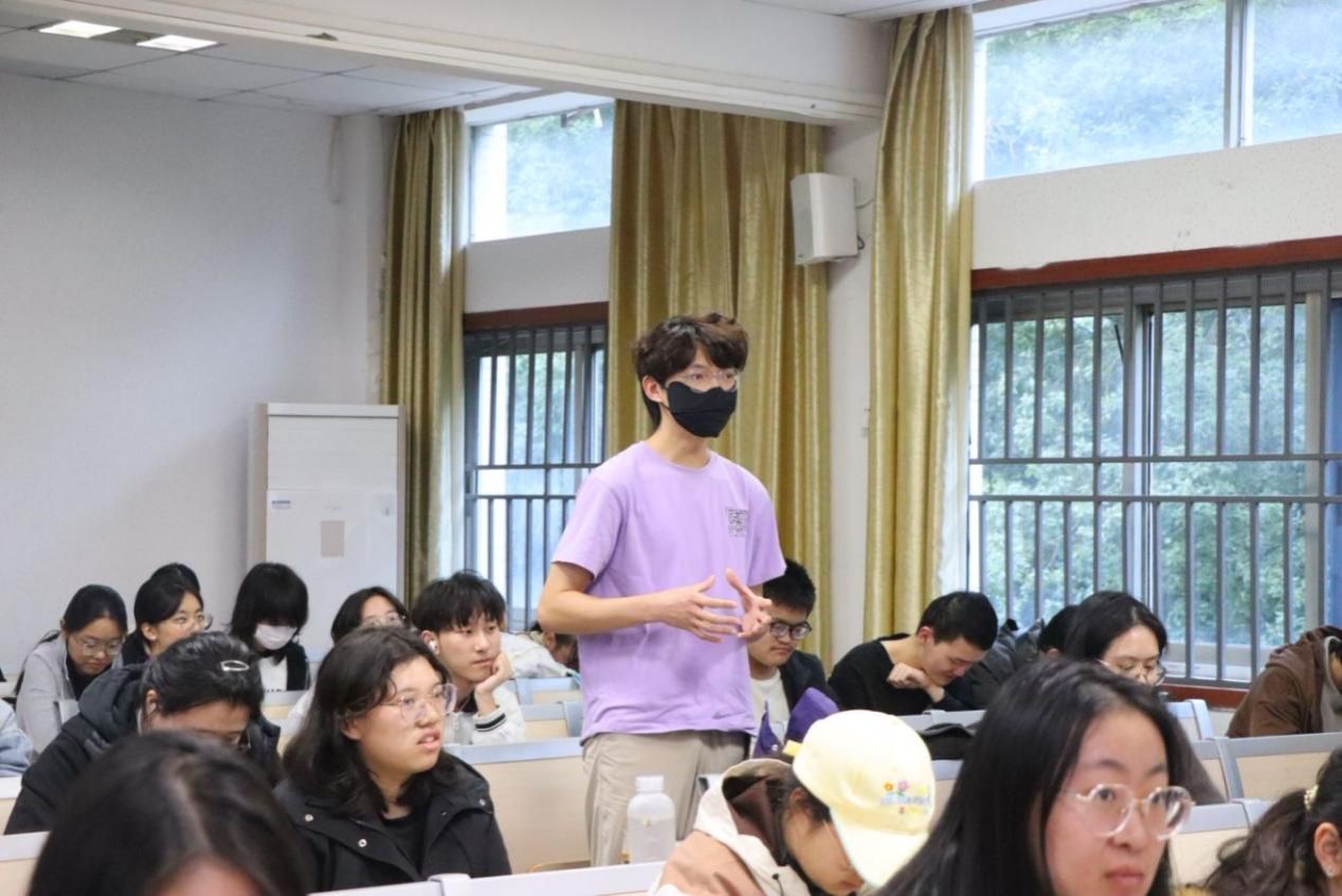 活动问答环节气氛热烈,学生提问内容广泛,涵盖初学者书籍推荐、译者作为知识生产者的体现等议题。覃江华教授耐心地逐一解答。他指出人类的情感意志是AI难复制的核心特质,提升自身的行动力才是应对时代冲击的关键。